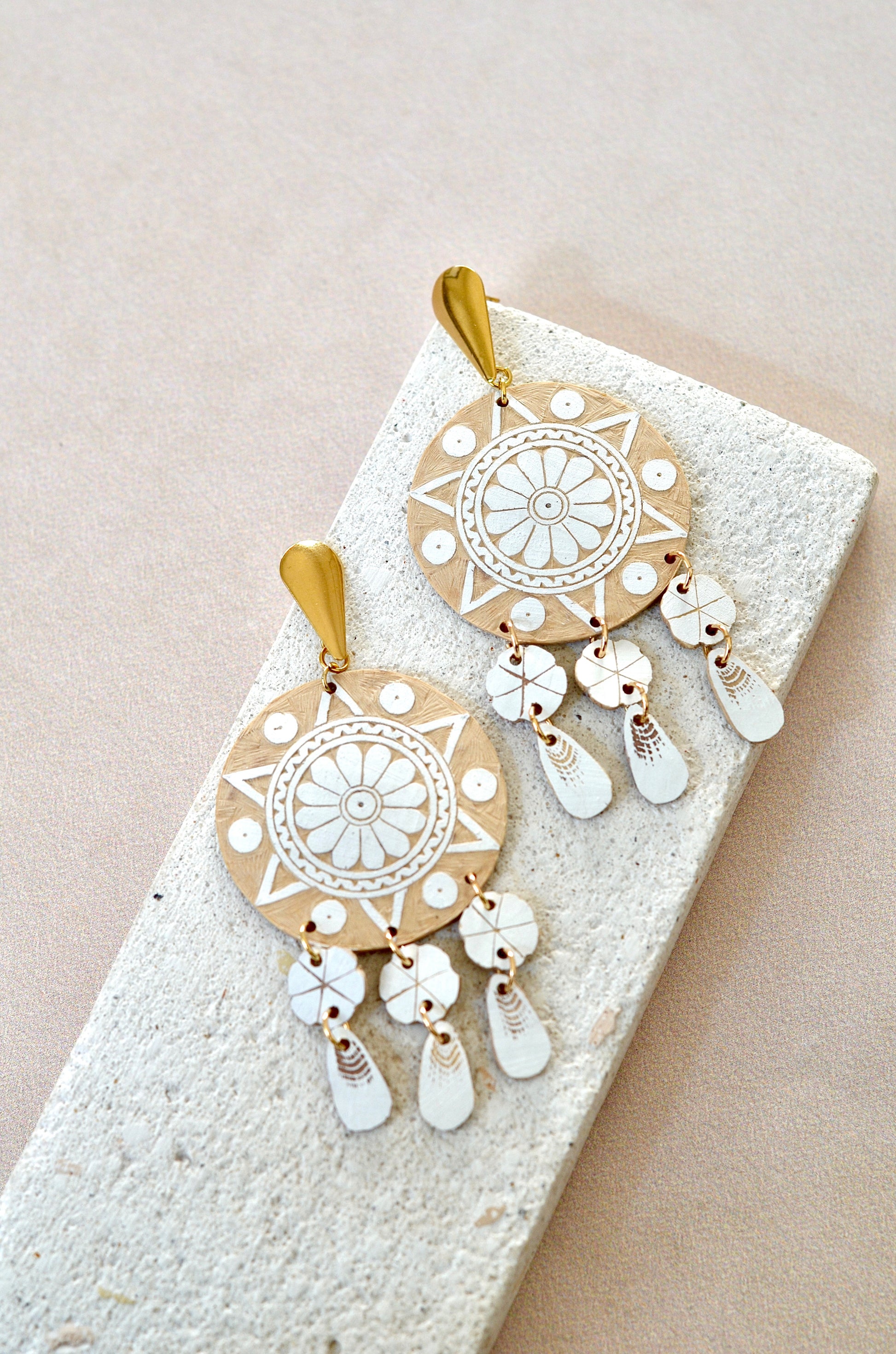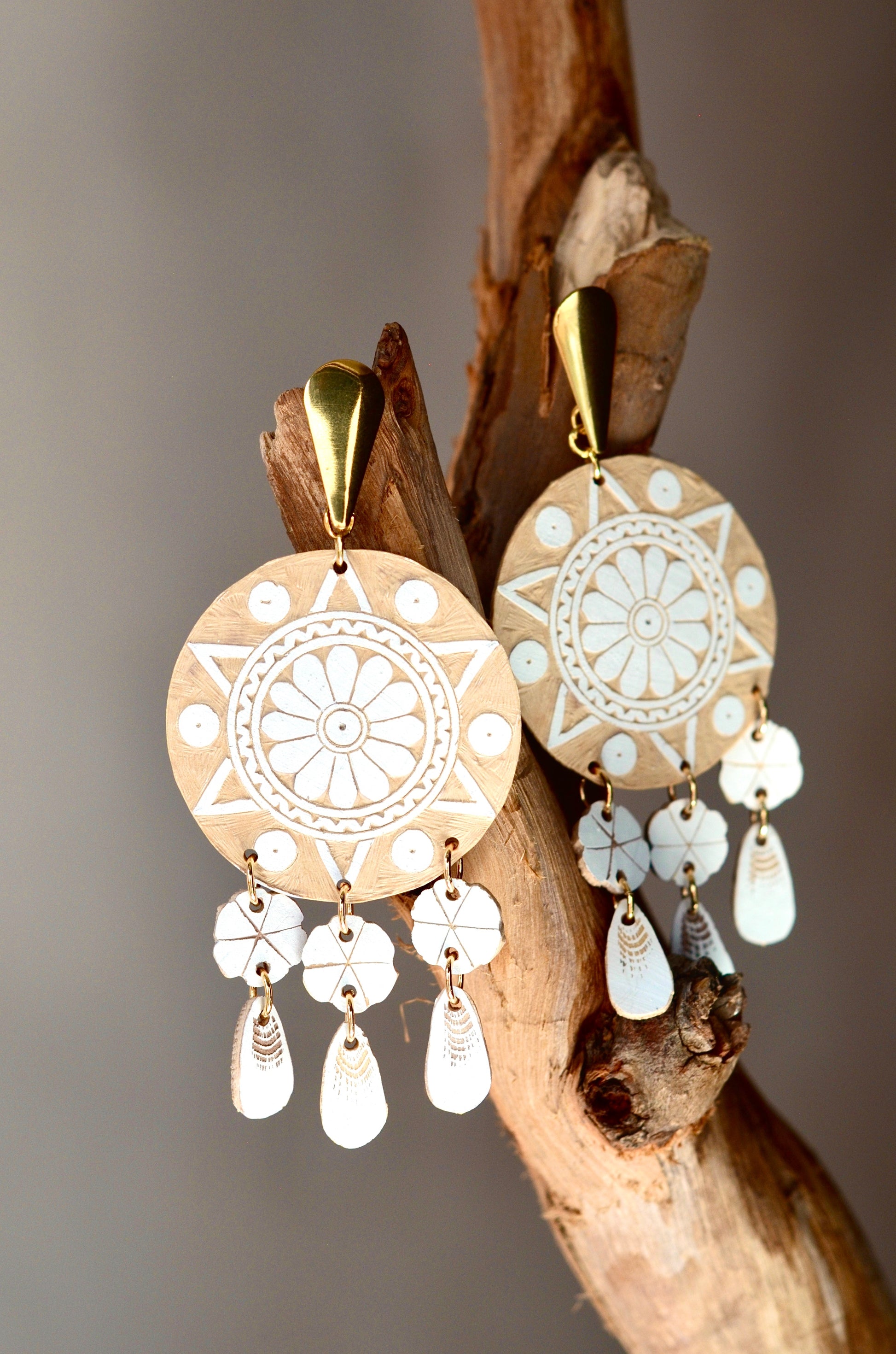 Al Sol celebra la abundancia floral. Tallados en jícara por artesanos oaxaqueños, estos aretes representan flores en plena apertura.