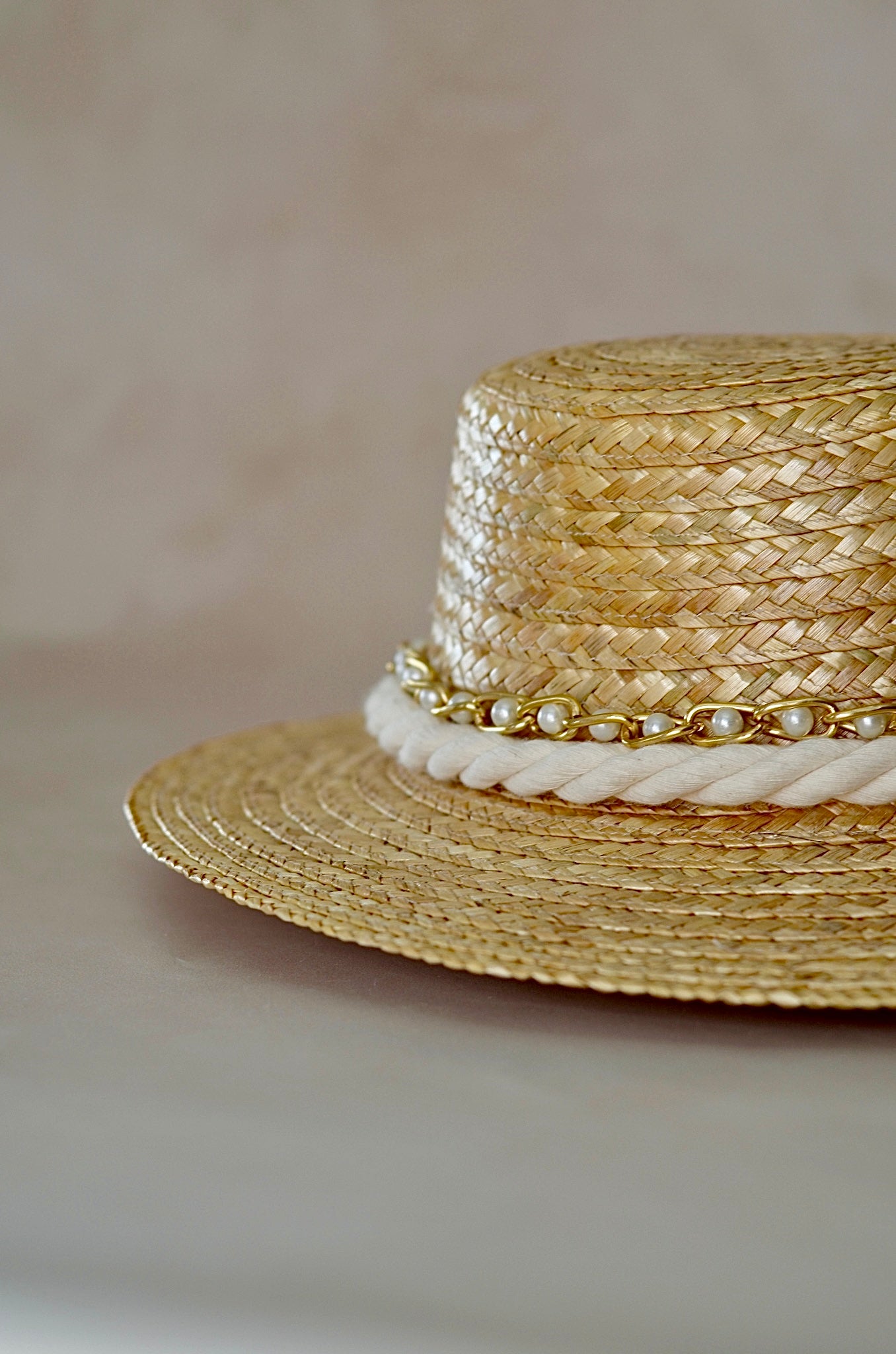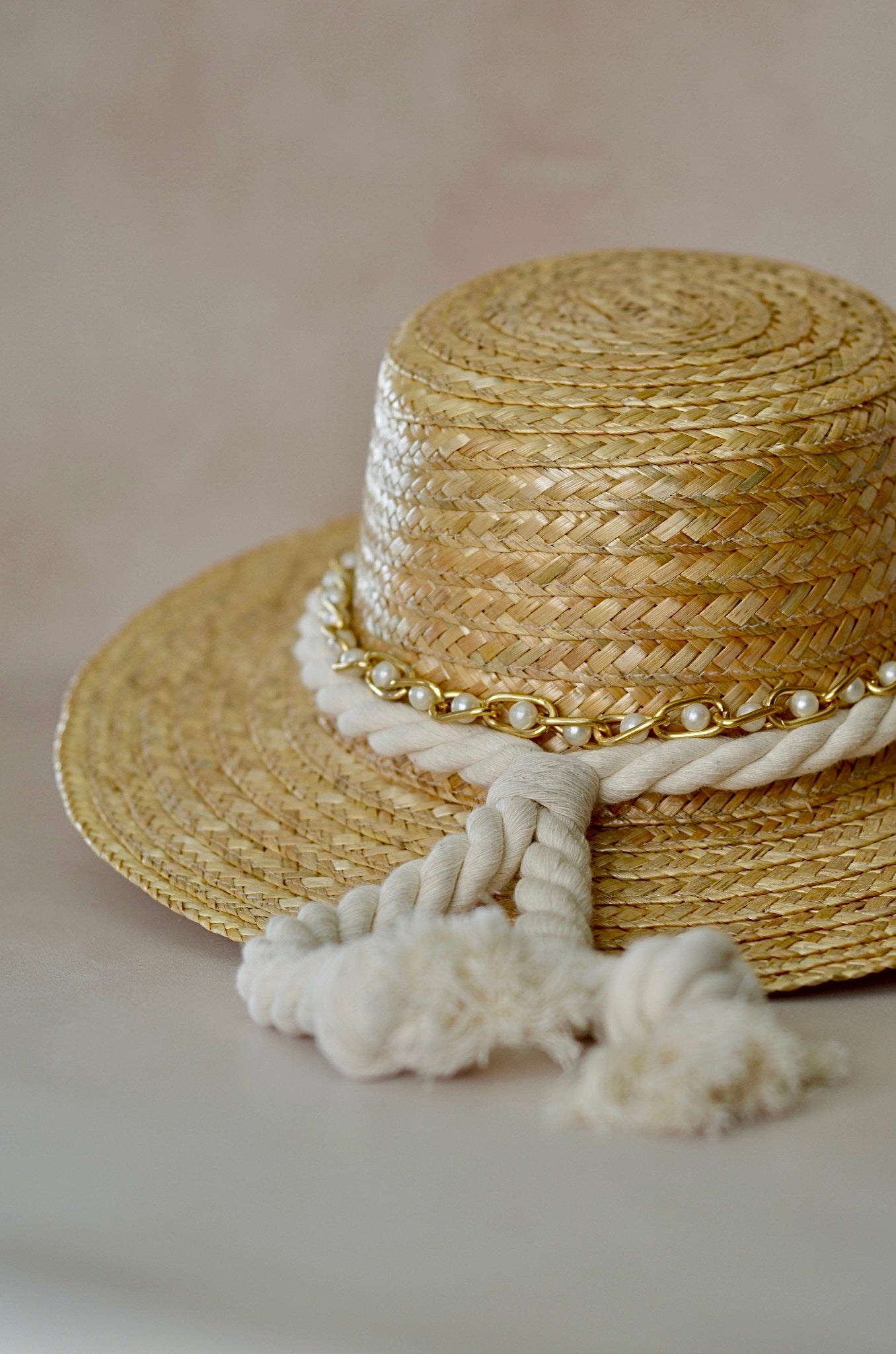 Sombrero de horma Cordobés, decorado con una toquilla de cuerda de algodón color crudo y una cadena delicada con perlas. Cada detalle se ensambla a mano, combinando carácter y sofisticación. Cada pieza es única: el trabajo artesanal garantiza que cada sombrero tenga su propio carácter y que ninguno sea exactamente igual a otro.