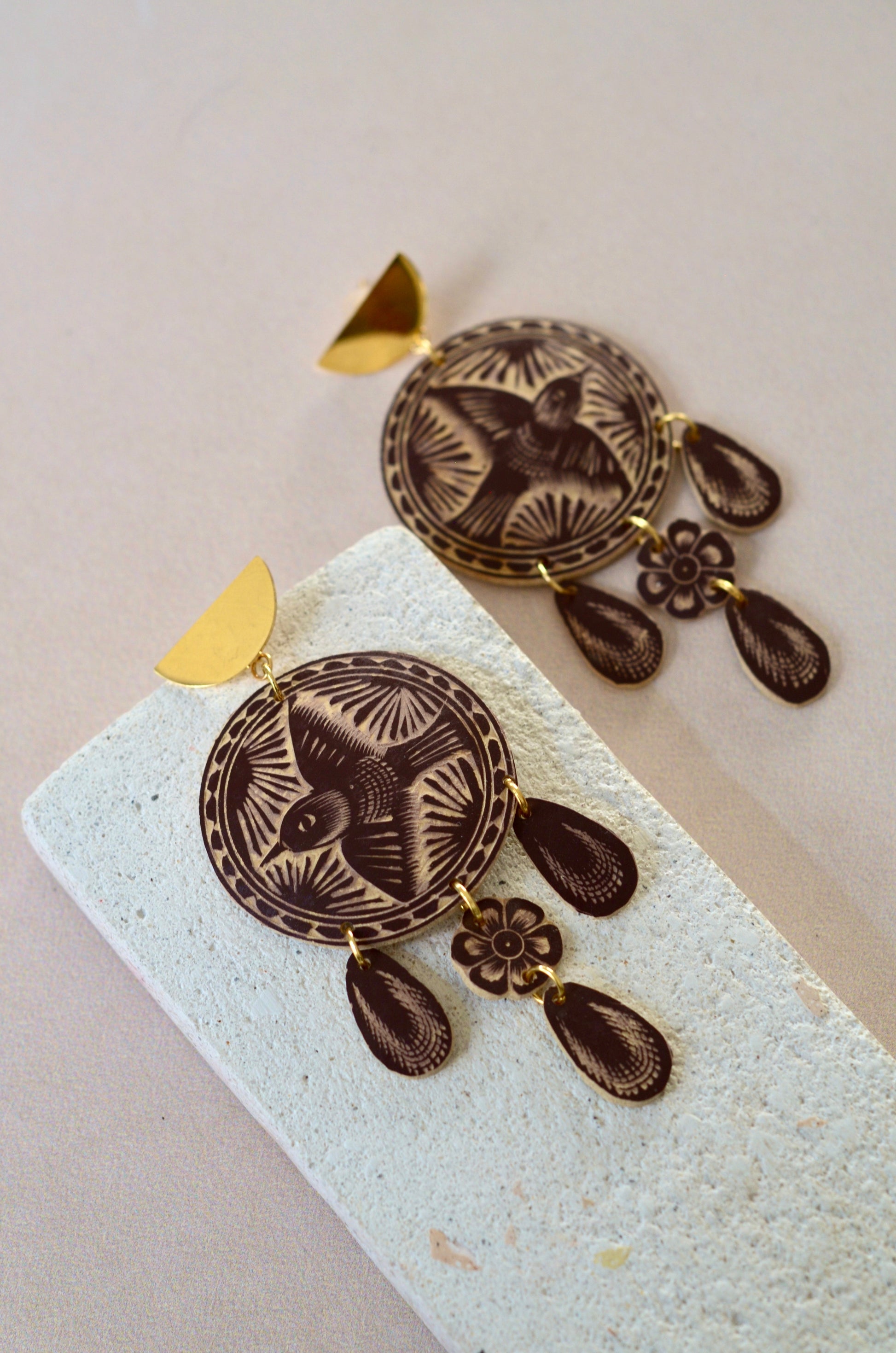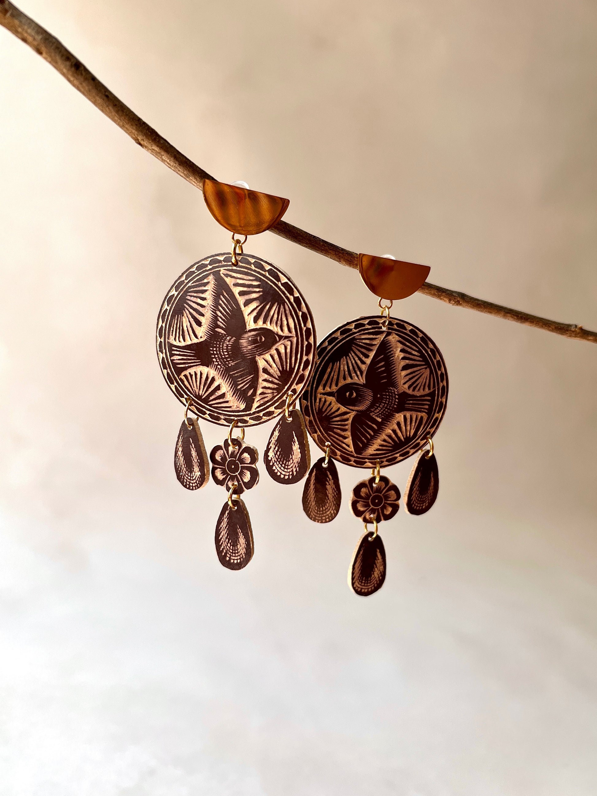 Aretes tallados a mano en jícara natural.