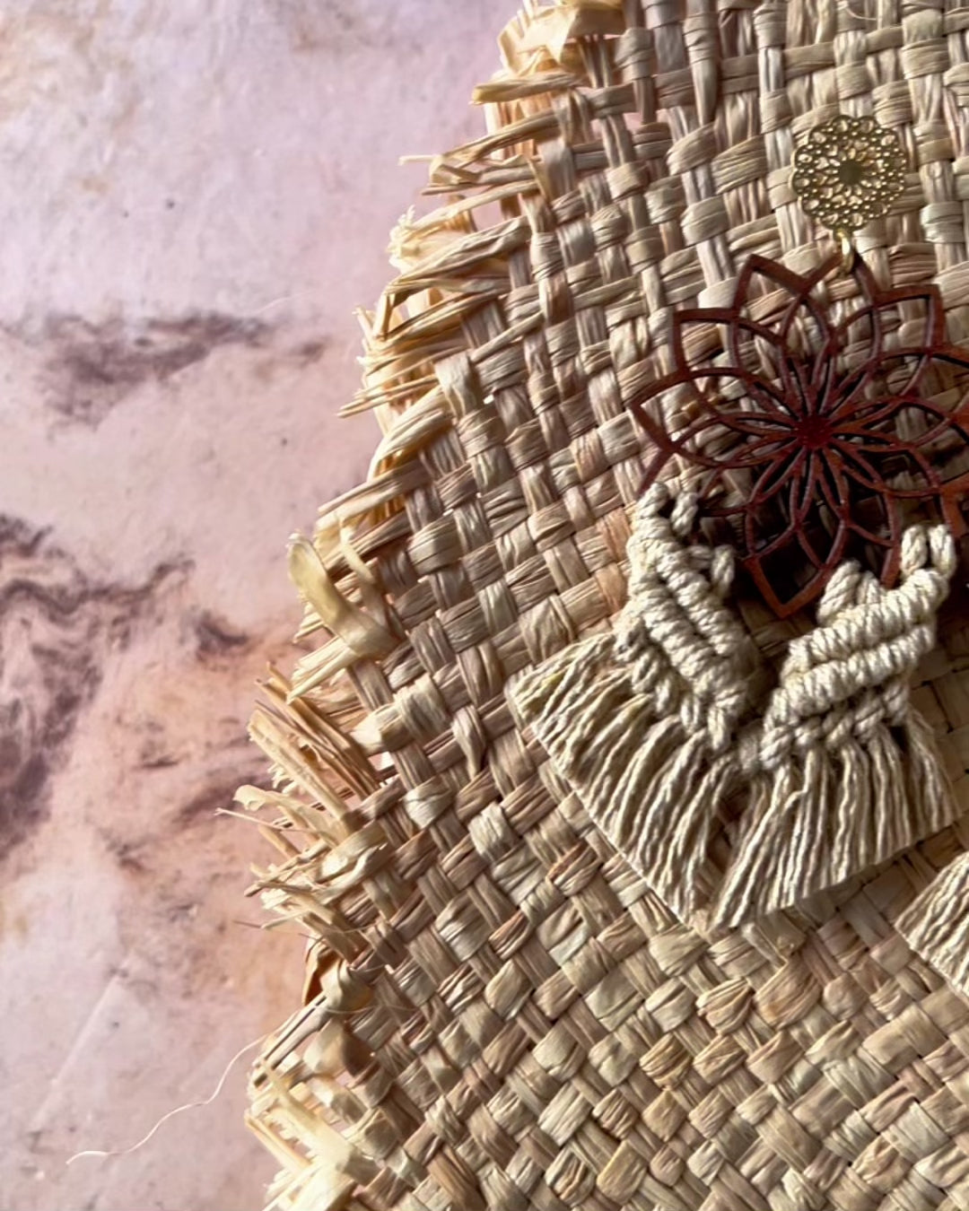 Otros accesorios (sombreros, sandalias, aretes sin macramé): Limpiar con paño seco o ligeramente húmedo si hay alguna mancha. Evitar exposición a humedad excesiva y fuentes de calor.