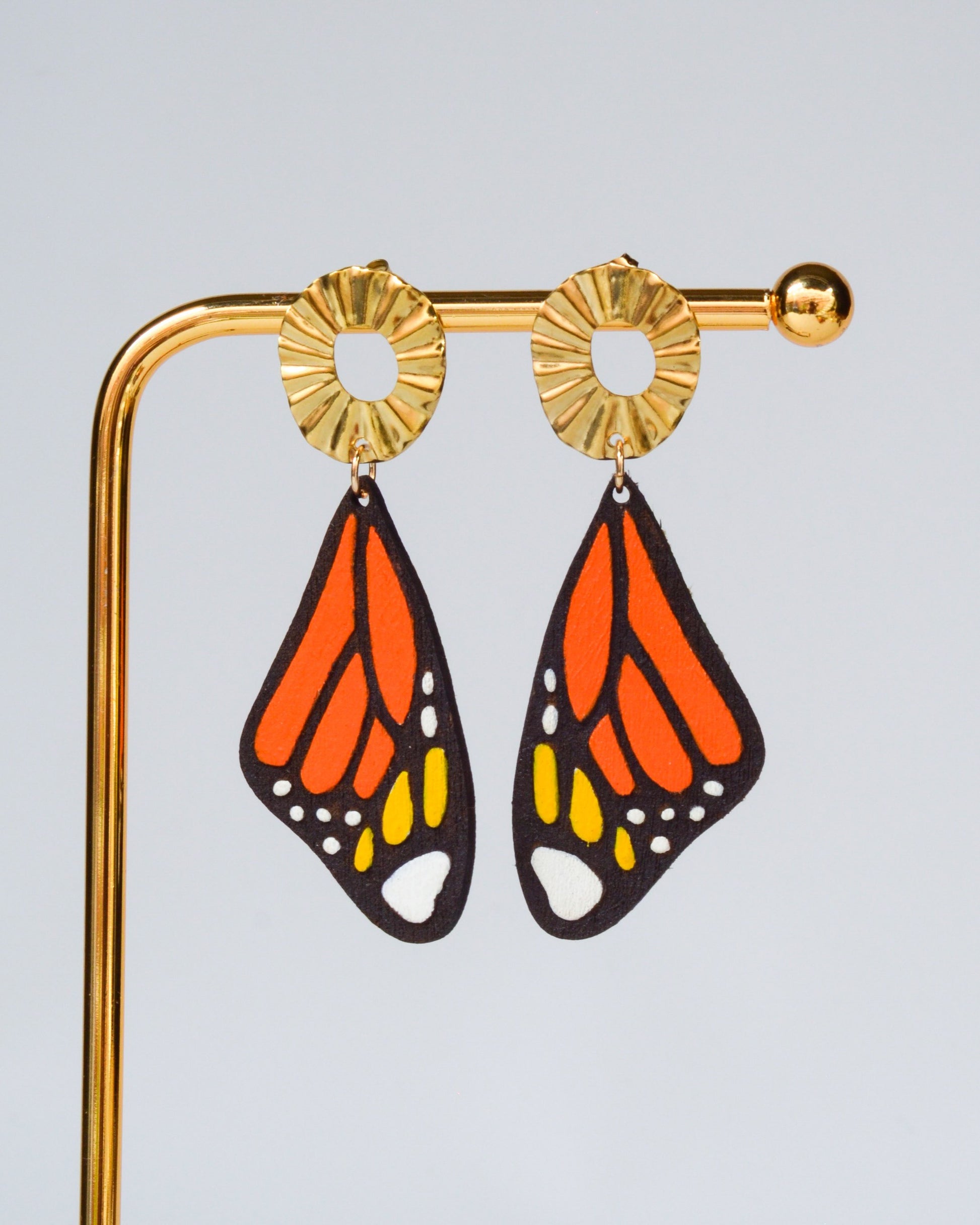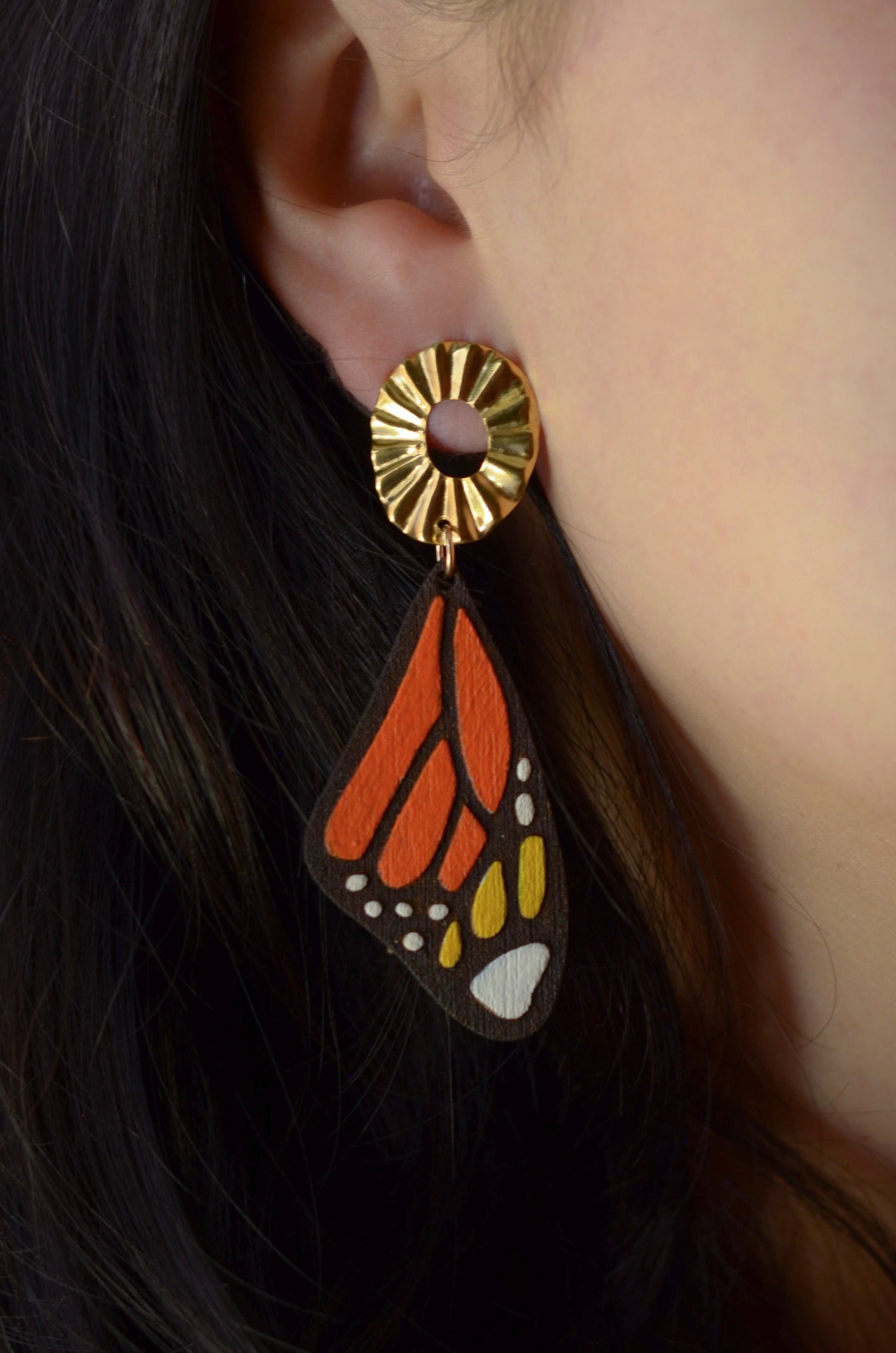 Los aretes Monarca, pintados a mano, capturan la ligereza y esencia de la mariposa monarca. Cada par refleja el cuidado y la dedicación del trabajo artesanal, combinando naturaleza y diseño contemporáneo en un delicado equilibrio.